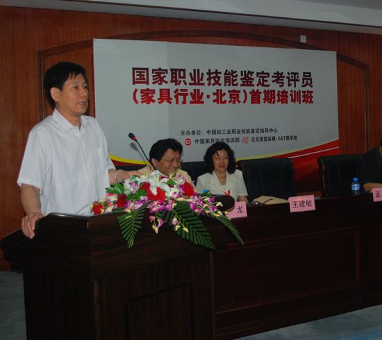 在開班典禮上,中國(guó)國(guó)家人力資源和社會(huì)保障部劉新昌處長(zhǎng)針對(duì)中國(guó)國(guó)家職業(yè)技能鑒定工作未來的趨勢(shì)和發(fā)展方向做了精彩的報(bào)告,輕工業(yè)聯(lián)合會(huì)孟琪主任針對(duì)如何開展家具行業(yè)技能鑒定工作做了實(shí)際意義的報(bào)告,兩位領(lǐng)導(dǎo)的精彩報(bào)告博得了在場(chǎng)所有學(xué)員的熱烈掌聲。中國(guó)家具協(xié)會(huì)劉金良副理事長(zhǎng)針對(duì)此次培訓(xùn)班做了簡(jiǎn)短而精煉的發(fā)言,代表中國(guó)家具協(xié)會(huì)表示有信心把家具行業(yè)的職業(yè)資格認(rèn)證教育發(fā)展的越來越好。北京國(guó)富縱橫管理咨詢有限公司國(guó)際•AST商學(xué)院作為中國(guó)家具協(xié)會(huì)的培訓(xùn)部,中國(guó)家具行業(yè)職業(yè)資格認(rèn)證教育執(zhí)行機(jī)構(gòu)為此次培訓(xùn)班提供精良的會(huì)務(wù)保障,總裁趙龍博士在開班典禮上風(fēng)趣幽默的發(fā)言,表示北京國(guó)富縱橫管理咨詢有限公司一定會(huì)把家具行業(yè)的職業(yè)資格認(rèn)證教育推向高潮,有信心出色地完成中國(guó)家具協(xié)會(huì)交給北京國(guó)富縱橫的任務(wù)。